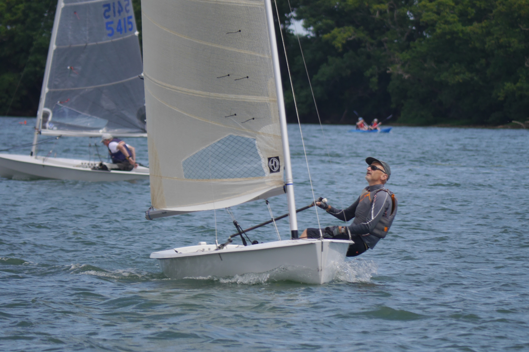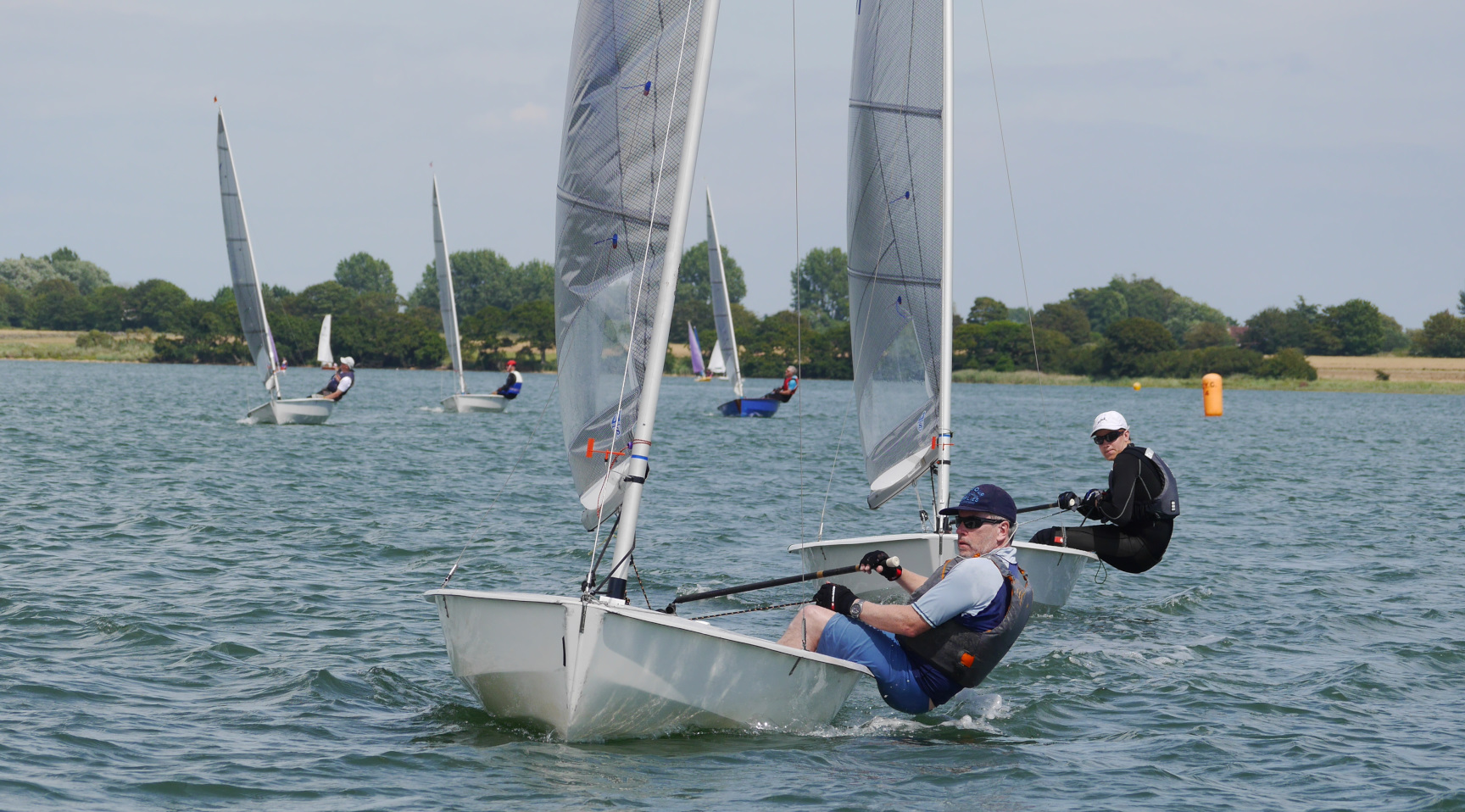 The Race officer, Phil Allen, set an inverted P course with the committee boat toward the Bowling end of the CYC lake. During the briefing he explained that there was no requirement to pass through the Start Line until the final lap, giving the competitors full freedom to make their way upwind in any way they liked. In race one the tide was very strong pushing the boats back from the line, but as the afternoon progressed the tide changed causing a few boats to cross the line early.
