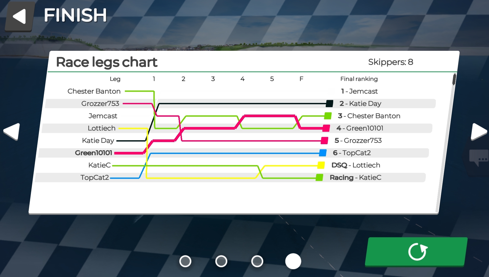 Not surprisingly, the Series was won by Alastair, with a clean sweep of all the races. Which shows that in virtual racing practice and experience count just as much as the real world. Second place went to Katie Day with an impressive series of results, third was Chester Banton, and fourth was Chris Grosscurth. Chris was doing well up to the medal race, where he scored his worst result, and saw the double points hurt his result.